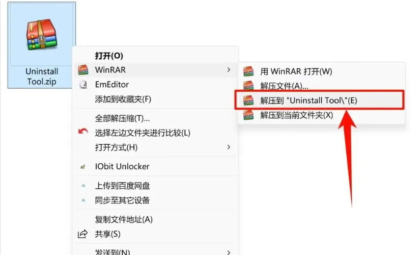 步骤 1: 选中下载的【Uninstall Tool】软件压缩包,鼠标右击选择【解压到 Uninstall Tool】。