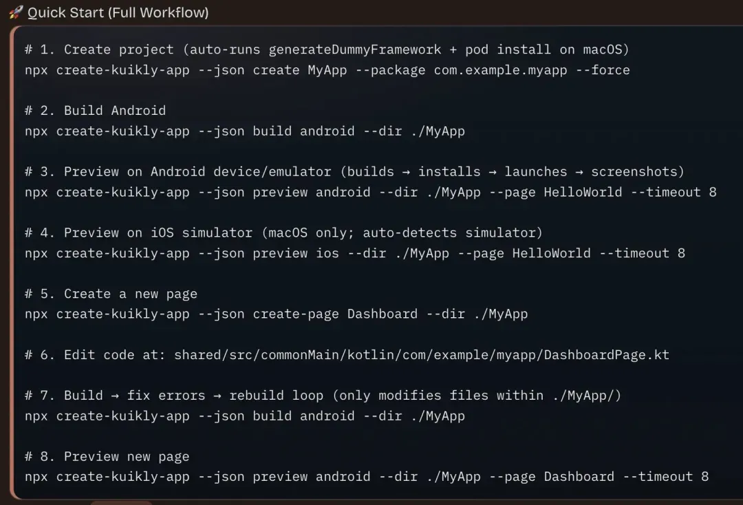 第一,把项目创建、配置和构建过程完全CLI化。以前Kuikly只提供IDE插件来生成模版项目,现在一条命令就能创建完整的Kuikly跨端工程——shared模块、Android/iOS/鸿蒙/H5等宿主App,一步到位。