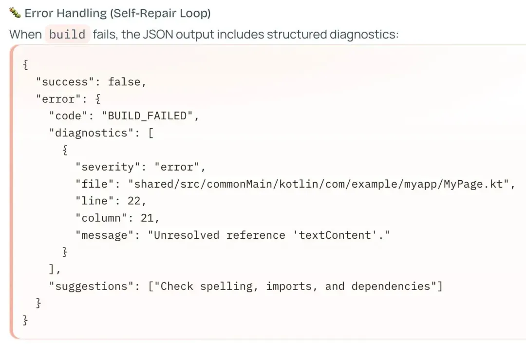 第二,让所有命令输出结构化JSON。编译失败时,错误不再是几百行Gradle日志,而是被解析成精确到文件、行号和修复建议的结构化数据。AI拿到这些,可以直接定位、修改、重编译——自动修复闭环,不需要人介入。