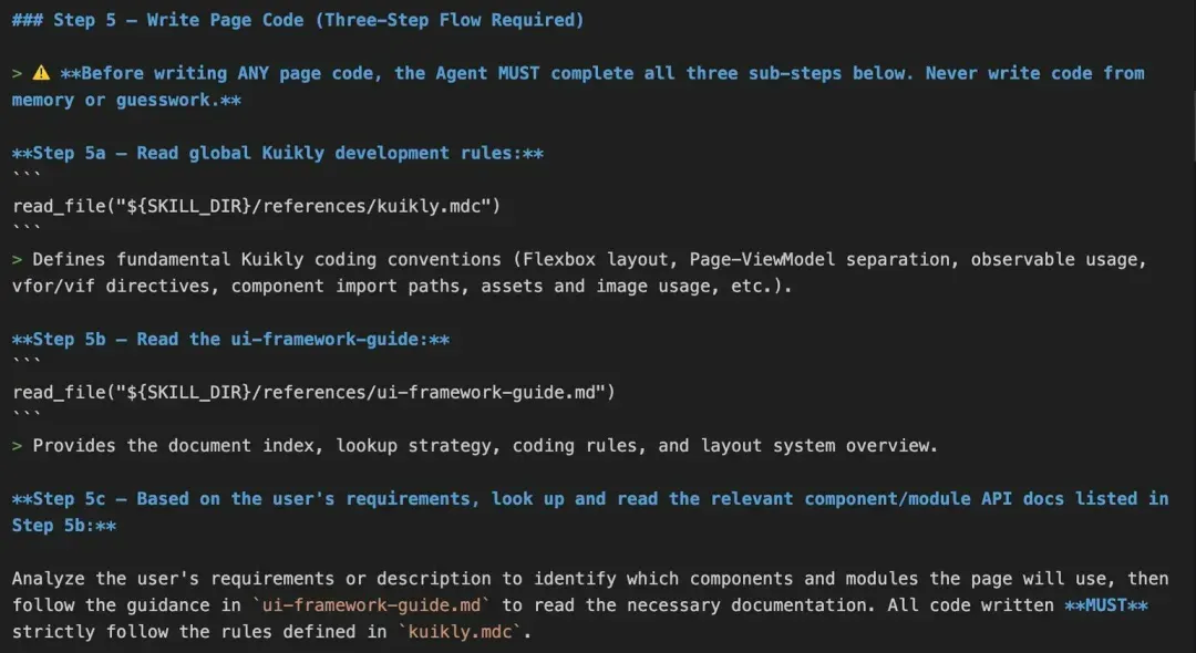 第三,也是最重要的,把Kuikly的编程知识"喂"给AI。我们把组件API、常见错误、版本兼容信息整理成Skills文件,塞进AI的工作记忆。其中有一条特别值得一提的规则——"禁止凭记忆写代码"。AI极容易拿React或Flutter的经验来猜Kuikly的API,猜错了就编不过。所以SKILL强制它先查官方文档和示例,查完再动手写。具体指令如下图所示:
