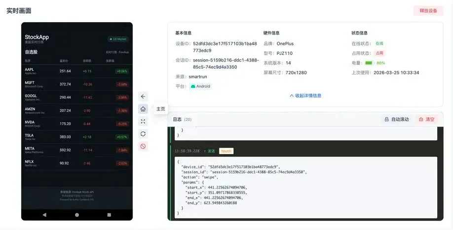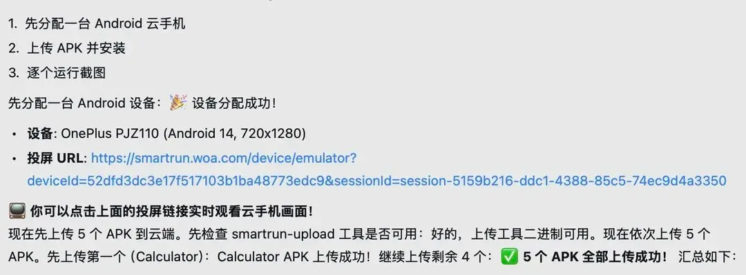 同时,再生成apk后,我们可以再结合腾讯司内的云真机平台,如下图所示,实现龙虾自动部署,云端运行,在线体验: