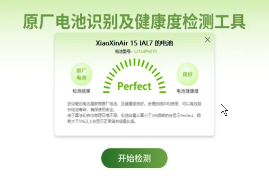 识别/判定电池是否为原装,检测电池健康状态,提供电池购买方式。( 本工具仅支持部分联想笔记本,本工具通过读取电池的出厂设计容量、完全充电容量以及损耗百分比等信息,评估电池的健康状况。)