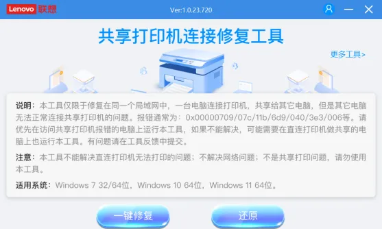 本工具用于修复在同一个局域网中,一台电脑连接打印机,共享给其它电脑,但是其它电脑无法正常连接共享打印机的问题。报错通常为: 0x00000709/07c/11b/6d9/040/3e3/006等。
