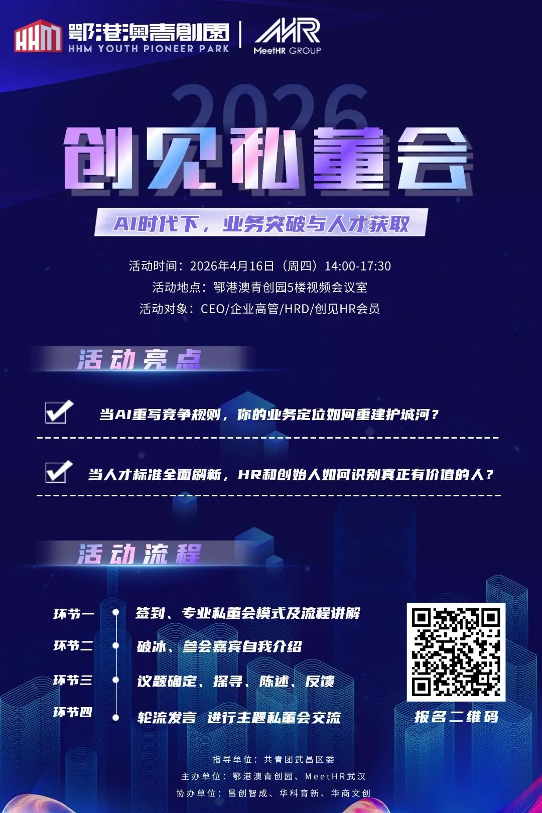 私董会作为高端决策者的深度共创场域,以 “聚焦真问题、碰撞真智慧、输出真方案” 为核心,让同频决策者在私密环境中坦诚交流、精准破局。鄂港澳青创园深耕企业服务多年,深知AI时代下企业面临的业务重构与人才困境,特联合 MeetHR 武汉搭建此次平台,旨在以小而精的深度交流模式,为企业核心决策者提供实战解决方案,助力企业在变革中站稳脚跟、持续增长。