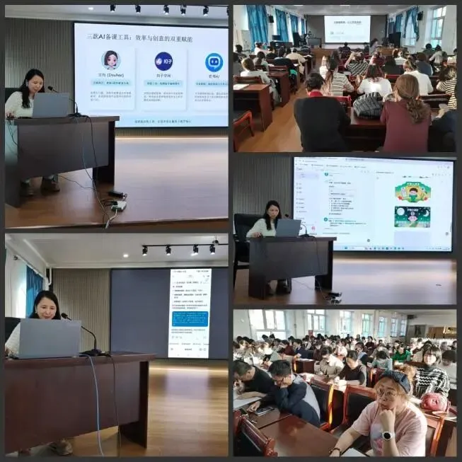 随后,他重点讲解了提示词和DeepSeek在教学中的七个典型应用案例,涵盖作文批改、试题命制、教学设计、图文识别、PPT制作、主题班会策划及思维导图生成等。通过现场演示,教师们直观感受到DeepSeek在多维度作文点评、个性化教学设计和高效内容生成方面的强大能力。