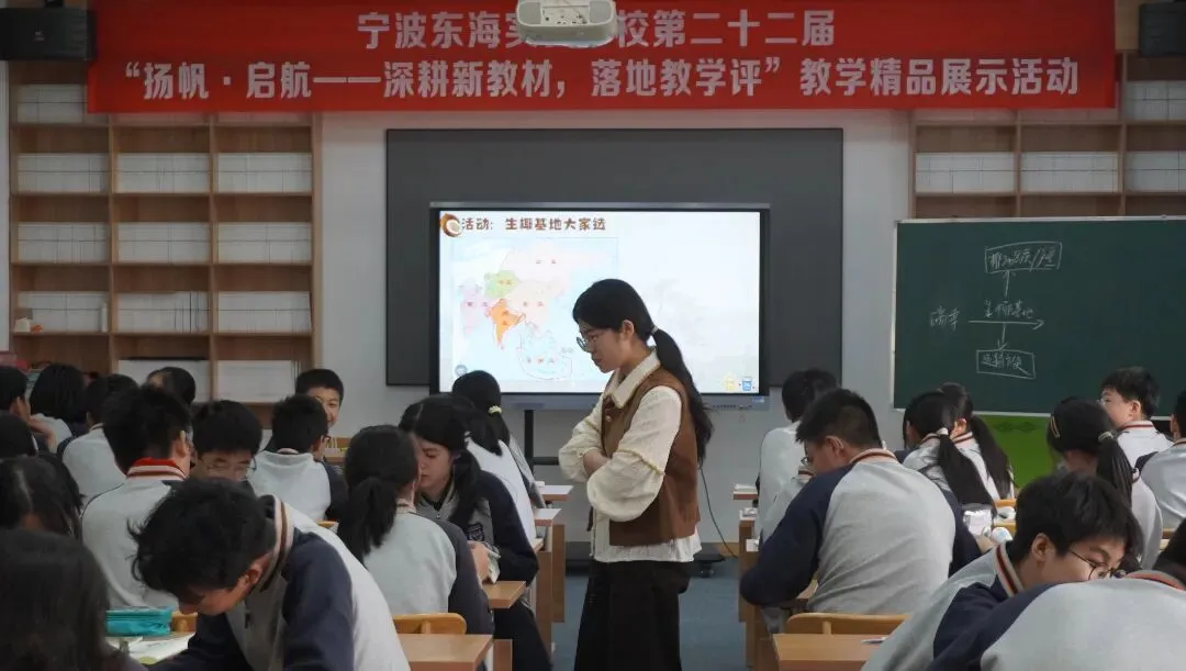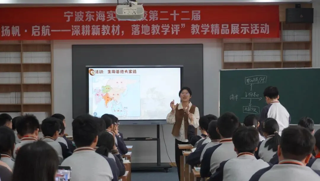 我校新生代教师朱紫露带来《解密瑞幸“生椰帝国”》的公开课。课堂开篇,教师以学生熟悉的瑞幸生椰拿铁为切入点,结合生活化情境提问“大家常喝的瑞幸生椰拿铁,其核心原料生椰的供应基地究竟选在何处?”,创设小组活动比较分析不同层面的区位条件,突出本节课的核心教学内容——东南亚地区,在过程中巧妙的利用Ai技术进行地图展示与活动小结。随后教师创设“咖啡店选址”这一情境问题,引导学生思考探究,由此对中南半岛的自然与人文环境进行讲解。课堂中学生积极互动,思维活跃,在情境创设中主动地探究并学习相关知识,课堂氛围融洽,重难点落实到位,收获良好效果。