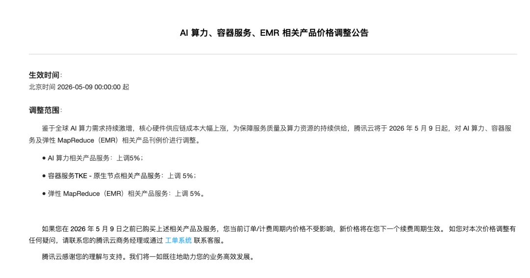国家数据局的数据印证了这一点:2026年3月,中国日均Token调用量突破140万亿,相较2024年初的1000亿增长超千倍。从供需关系看,算力已经从“充裕”变成了“紧缺”。腾讯云在公告中给出的涨价理由是“全球AI算力需求持续激增,核心硬件供应链成本大幅上涨”。这不是托词,而是事实。