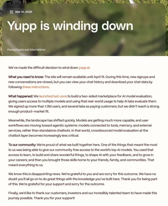 2026年3月31日,Yupp宣布将于4月15日正式关闭。从成立到关门,仅存活22个月。创始人Gupta在告别博客中写道:“我们的产品与市场契合度不够高。”而真正的死因,比这句话要残酷得多——投资人的钱还没花完,AI技术的演进就让其市场不复存在,这一切发生在短短几个月之间。