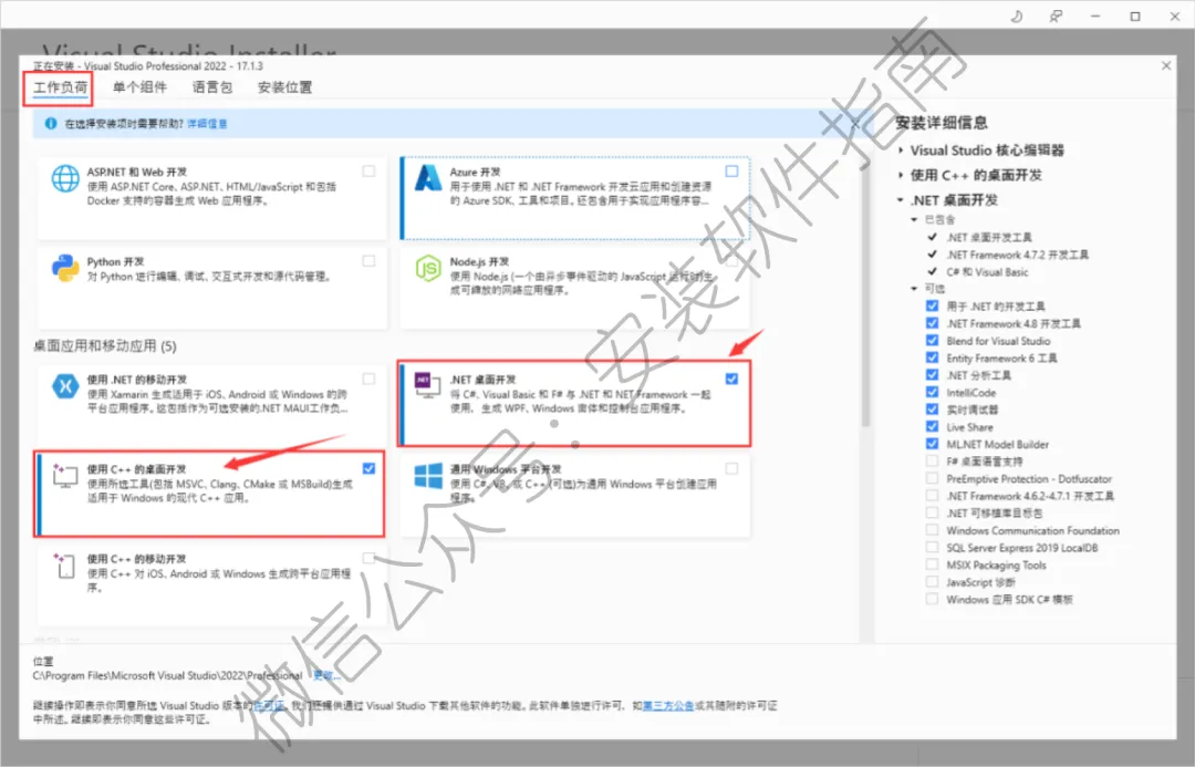 6、勾选需要安装的应用(如:.NET桌面开发、使用C++的桌面开发,根据自己的需求勾选即可)