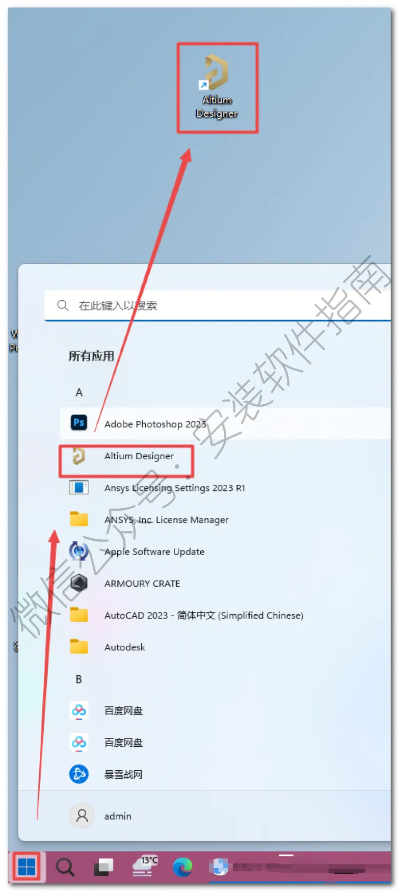 11、在桌面左下角的开始菜单中找到"Altium Designer"软件,鼠标左键拖拽到桌面上即可创建桌面快捷方式