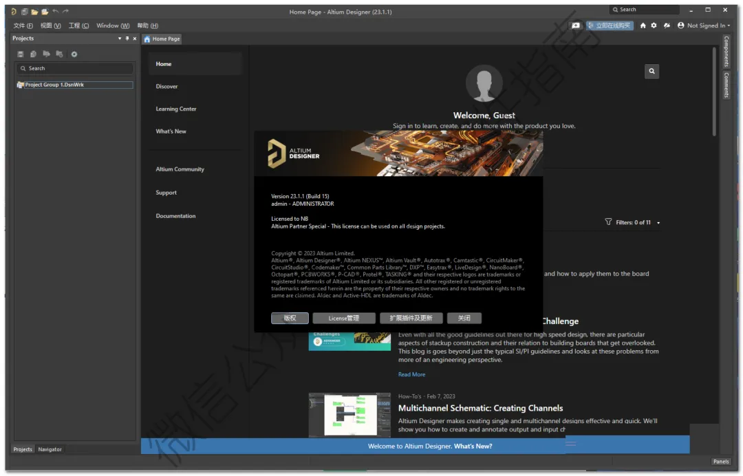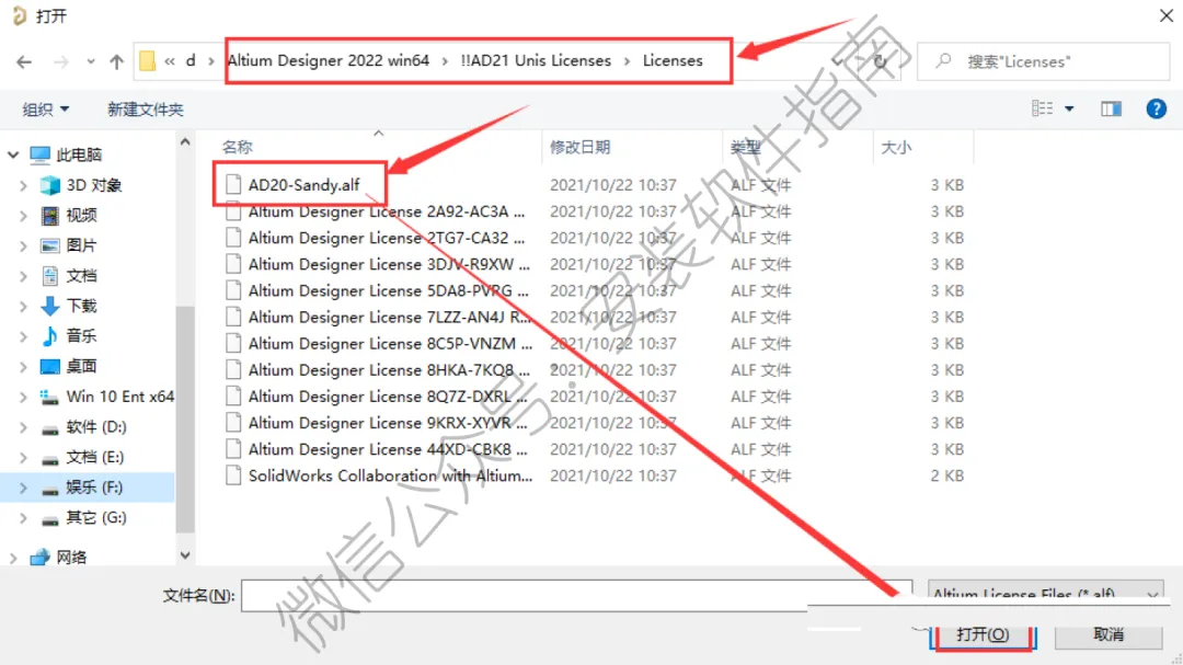 17、找到解压后的“Altium.Designer.23”文件夹路径,打开“licenses”文件夹,选中“AD20-Sandy.alf”文件,点击“打开”
