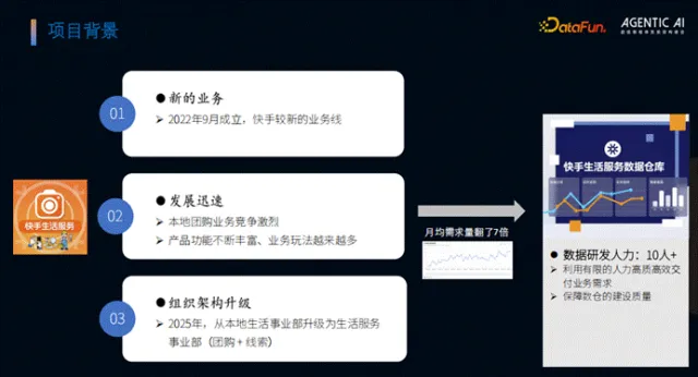 快手生活服务业务线成立于 2022 年,相较于快手其他成熟业务线,具有三大显著特点:一是业务新颖,处于快速探索阶段;二是发展迅猛,每日不断迭代新玩法、新功能,业务复杂度持续提升;三是业务边界拓展,2024 年组织架构升级后,业务范围从团购延伸至线索广告等领域,需求规模呈爆发式增长。