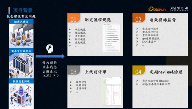 具体内容为:制定了完善的流程规范,包括命名规范、埋点规范、开发测试规范等,建立了需求交付效率、需求交付时长、中间层依赖率、app 依赖模型数、DQC 覆盖率等效能指标,要求上线前完成模型、代码评审及方案评审,并通过每周直销 Review、按季度/半年集中治理的方式管控质量。