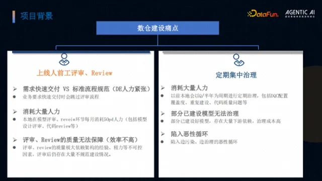 但实践后发现效果不及预期:流程规范执行不到位,需求压力大时易跳过评审环节;评审阶段人力消耗大(每月约 50 人日)且依赖架构师经验导致质量不可控;集中治理周期长、下游依赖多,陷入“边治理边污染”的恶性循环。基于此,团队转向探索 AI 驱动的智能化解决方案。