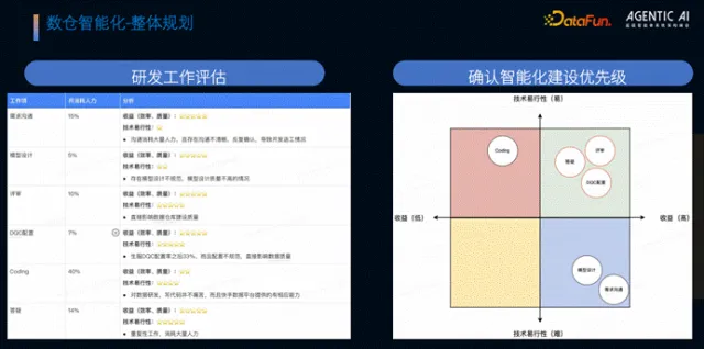 团队从收益高低与技术可行性两个维度,对数仓研发各环节进行评估,最终确定核心突破方向:评审(收益最高、技术可行性最高)、DQC 配置(数仓质量核心,需求迫切)、答疑(重复工作多,人力消耗大);暂不优先投入需求沟通(实现难度极高)、模型设计(实现难度高)、编码(平台已有基础能力,人力占用高但难度低)。