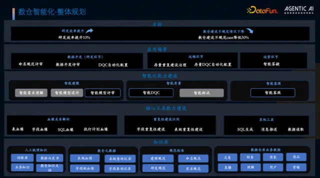 项目核心目标是通过智能化产品实现研发人效提升 10%,数仓建设不规范案例减少 50%。整体架构分为三层:底层为知识库梳理,涵盖人工梳理词根、数据白皮书、业务知识、数仓元数据、标准规范及脱敏后的业务数据;中间层为核心工具能力建设,包括血缘解析、重复建设识别等工具;顶层为智能化能力构建,涵盖智能建模、智能质量、智能客服三大模块,最终应用于数据开发、运维及运营全环节。