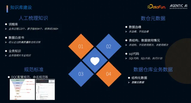 知识库是智能化能力的基础,团队从四方面完成建设:一是人工梳理词根体系,沉淀业务过程词根 123 个、原子指标词根 94 个、修饰词词根 1900 余个,为语义一致性提供支撑;二是编制数据白皮书,耗时三个月梳理高质量数仓知识库,作为核心知识来源;三是整合元数据,包括表/字段血缘、使用频次、资产等级、SQL 代码及执行计划等,并新增 SQL 片段切分能力;四是规范标准体系,明确 DQ 配置、命名等各类规范,同时对业务数据进行脱敏处理,规避数据安全风险。