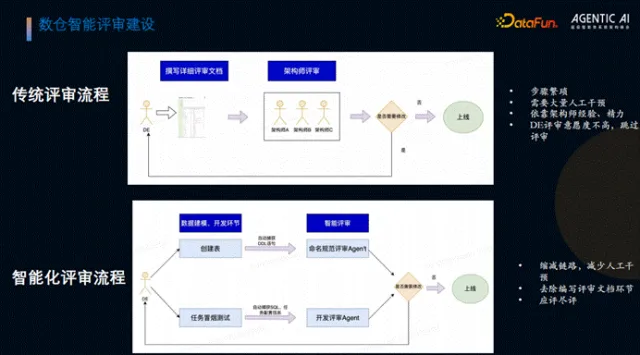 传统评审需研发人员撰写评审文档,再约3名架构师评审,流程低效、人力消耗大,且研发人员为赶进度易跳过评审,导致数仓出现语义混乱、重复建设等问题。例如,多名研发人员设计的表存在命名差异但核心内容一致、维度语义模糊、指标命名不统一等情况,给数据使用和维护带来极大困扰。
