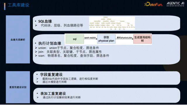 重点建设两大工具库:一是 SQL 血缘解析工具,将 SQL 抽象为语法树并层层解析,获取代码块层级及列血缘路径,同时清洗执行计划以匹配引擎操作动作,满足深层评审需求;二是重复建设识别工具,基于血缘解析结果,通过相似度算法识别字段级重复建设,结合大模型二次确认,通过执行计划判断表级重复建设。