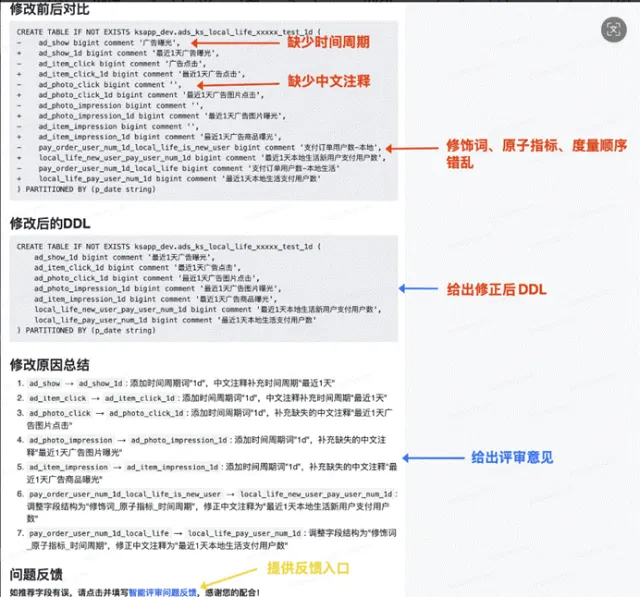 以下是一个案例:DDL 语句缺少时间周期、缺少中文注释,在修饰词、原子指标、度量顺序上有错乱的情况。我们给出了修正后的 DDL 语句和修改原因总结。目前以周为维度跟踪统计效果为:命名规范评审推荐准确率达 85%,执行率达 90%。