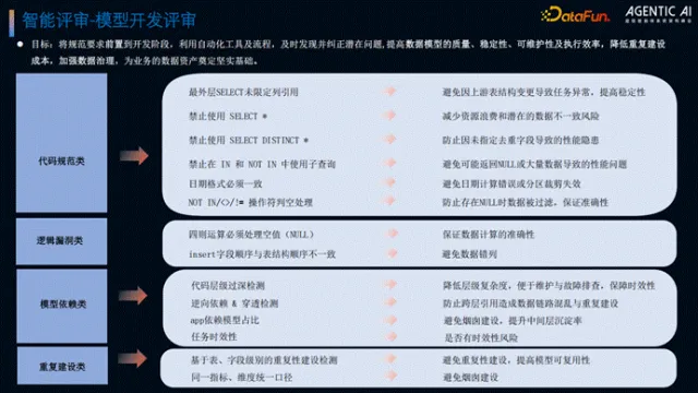 核心是先建立标准规范,从数仓建设初期梳理词根及命名规范,降低后续重构与治理成本;基于基础规范搭建简单工作流,借助大模型开展初步评审,虽准确率有限,但可有效规避基础不规范问题,逐步积累后再推进深度智能化能力。