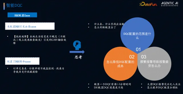 DQC 作为数仓质量生命线,存在三大问题:一是配置范围不明确,部分表/字段未配置 DQC 导致质量事故(如主键重复导致 GMV 数据翻倍错误);二是配置成本高,单条 DQC 配置需 1-5 分钟,研发人员配置意愿低;三是无效报警多,大量报警无人关注,掩盖核心风险。