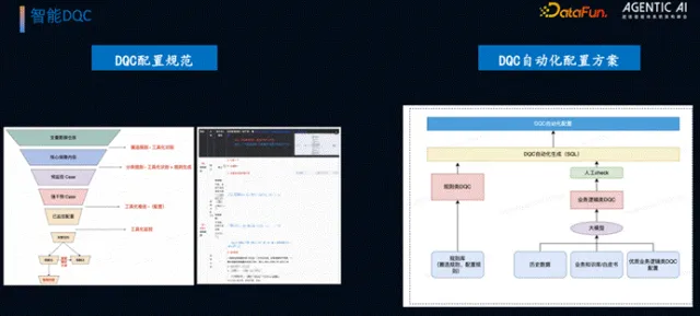 团队将 DQC 分为两类针对性处理:一是规则类 DQC,基于预设规则及 SQL 模板自动生成并配置,无需智能能力介入;二是业务逻辑类 DQC(如曝光次数大于点击次数、分项补贴金额之和等于总补贴金额),基于历史优质 DQC 配置、业务白皮书及历史数据,通过大模型生成规则,经人工校验后自动化配置,且此类 DQC 触发后直接阻断流程,保障数据质量。
