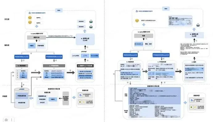 采用 RAG 架构,核心优化方向是提升问答准确性,而非技术创新。通过优质数据白皮书、全量元数据(表/字段血缘、描述、使用频次等)构建高质量知识库,由大模型预生成 QA 对;结合用户意图识别(找表、找字段、找报表),通过二阶段检索(表+字段检索)召回相关信息,经重排序后由大模型生成最终答案。
