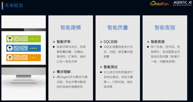 团队将从三方面深化智能化建设:一是建模层面,探索模型高内聚低耦合、易用性、扩展性的智能评价方法,攻克需求理解痛点,将业务需求自动转化为标准指标维度矩阵;二是质量层面,新增 DQC 巡检能力,对报警分类归因、锁定高风险项,构建自动化智能测试能力,校验主键一致性、行数、指标波动等;三是客服层面,拓展业务类问题解决方案,针对口径不一致、数据不可见等问题提供智能化解答。