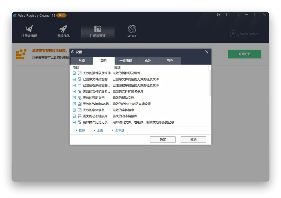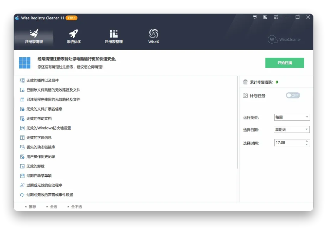 Wise Registry Cleaner 提供了三种选择:快速扫描,深度扫描,自定义扫描。