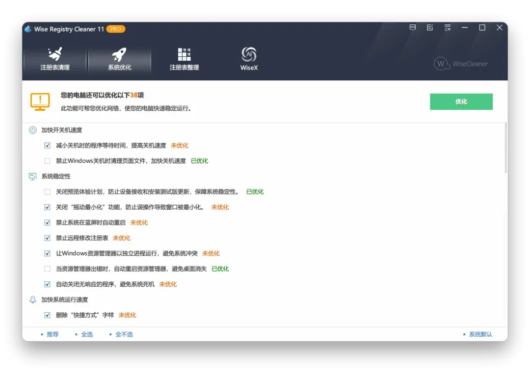 除了清理和清理 Windows 注册表之外,Wise Registry Cleaner 还可以优化相关系统设置,以提高系统速度和网络速度。
