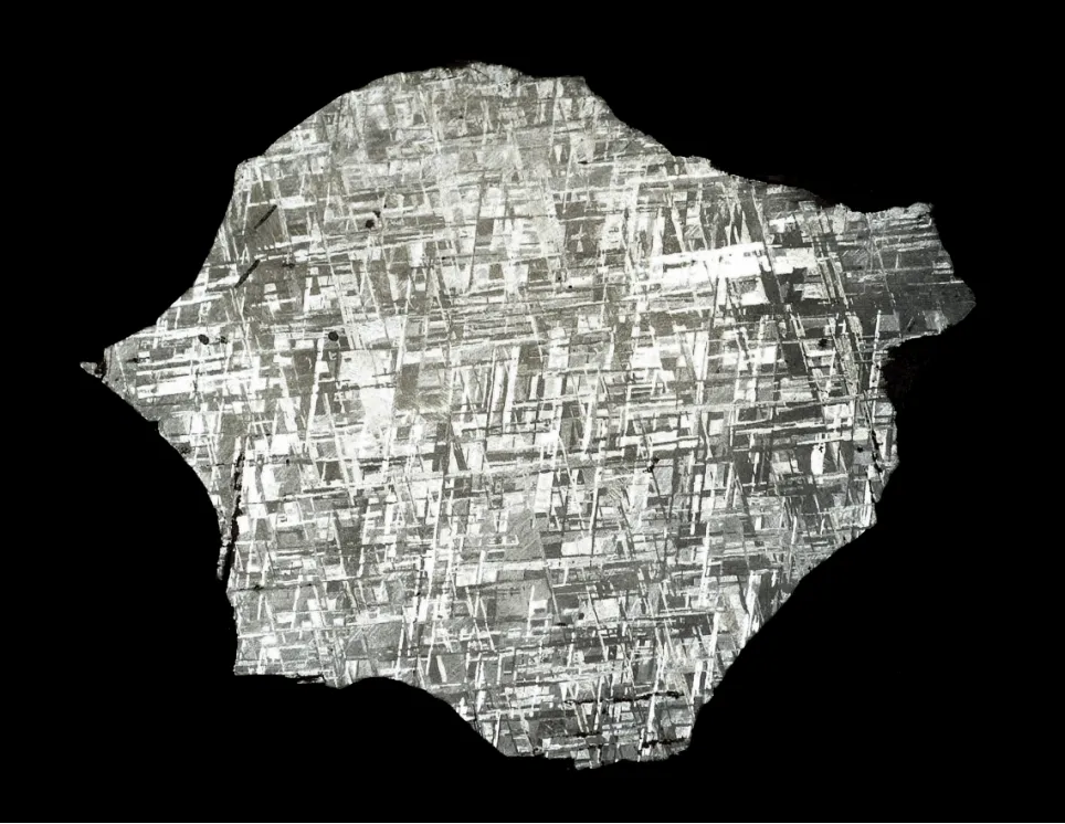 脱离母体的铁流星体失去了热源,只能在冰冷的太空中以每百万年几度的难以察觉的速度慢慢冷却。也恰好是这种极为缓慢的冷却,给了原子有序排列的时间。当温度逐渐降低到特定区间时,铁原子开始聚集,形成了如同精心排列的薄片状的 “铁纹石” 晶体。之后,被铁纹石排挤出来的镍原子在铁纹石薄片之间的缝隙中不断聚集,形成 “镍纹石” 晶体。两种晶体形成了交错纵横的片层结构,也就是铁陨石独有的 “魏德曼花纹”,它就像是宇宙漂泊的日志,漫长、耐心且精雕细琢,它又像是宇宙用46亿年完成的在工艺、时间、环境和不确定性上都走到了极致的手工项目。