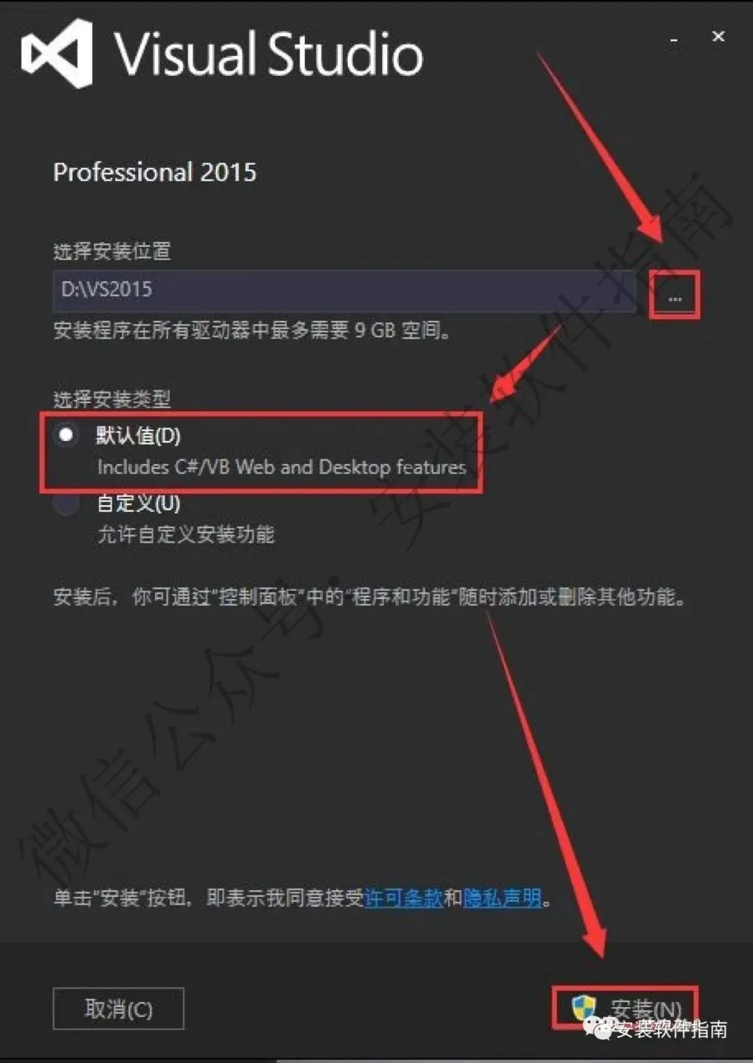 7.点【...】选择软件安装路径(建议安装在D盘里新建一个VS2015的文件夹),点选【默认值】,完成后点【安装】