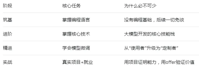每一步都是下一步的基础,没有捷径可走。但也正因如此,走完这条路的人,是真正具备AI大模型开发能力的工程师,而不是只会背面试题的“速成品”。