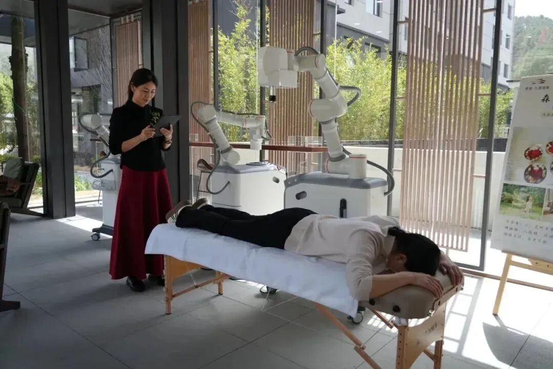 这是留坝县景逸九璟宿集内的一幕。在这家以康养为核心的民宿,高科技与传统养生正悄然交汇。