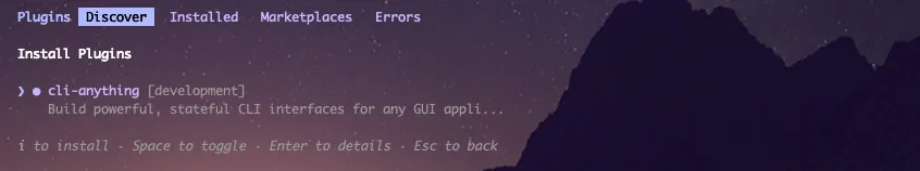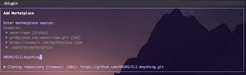 # 第一步:添加 CLI-Anything 插件市场/plugin marketplace add HKUDS/CLI-Anything# 第二步:安装插件/plugin install cli-anything也可以在Claude Code中交互式安装。
