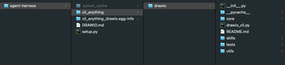 <software>/└── agent-harness/ ├── <SOFTWARE>.md # Project-specific analysis and SOP ├── setup.py # PyPI package configuration (Phase 7) ├── cli_anything/ # Namespace package (NO __init__.py here) │ └── <software>/ # Sub-package for this CLI │ ├── __init__.py │ ├── __main__.py # python3 -m cli_anything.<software> │ ├── README.md # HOW TO RUN — required │ ├── <software>_cli.py # Main CLI entry point (Click + REPL) │ ├── core/ # Core modules (one per domain) │ │ ├── __init__.py │ │ ├── project.py # Project create/open/save/info │ │ ├── ... # Domain-specific modules │ │ ├── export.py # Render pipeline + filter translation │ │ └── session.py # Stateful session, undo/redo │ ├── utils/ # Shared utilities │ │ ├── __init__.py │ │ ├── <software>_backend.py # Backend: invokes the real software │ │ └── repl_skin.py # Unified REPL skin (copy from plugin) │ └── tests/ # Test suites │ ├── TEST.md # Test documentation and results — required │ ├── test_core.py # Unit tests (synthetic data) │ └── test_full_e2e.py # E2E tests (real files) └── examples/ # Example scripts and workflowsCLI-Anything Hub,任何人都可以通过 PR 提交新的 CLI,社区可以直接浏览安装。提供了许多功能完备,测试充分,可以生产环境可用的CLI, 当我们安装完插件后,可以看到目录~/.claude/plugins/marketplaces/cli-anything/就有很多可以直接用的CLI了,Draw.io便是其中之一,它的目录结构如图:
