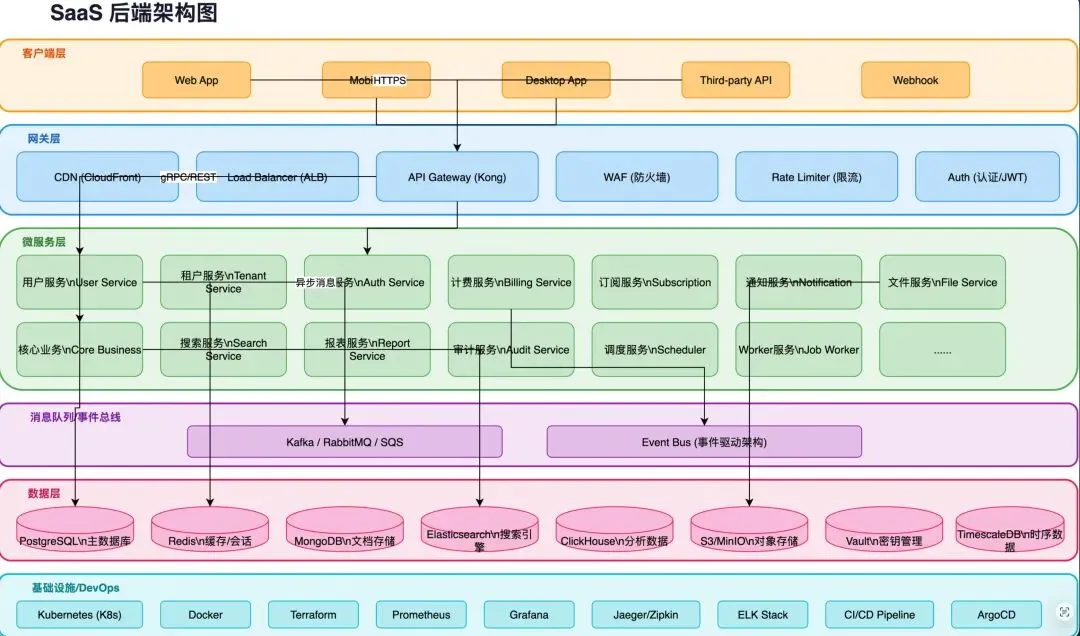 提示词: 帮我画一个saas后端的架构图,使用 cli-anything-drawio, 使其具有视觉冲击力,参考我的绘图风格[Image #1]
