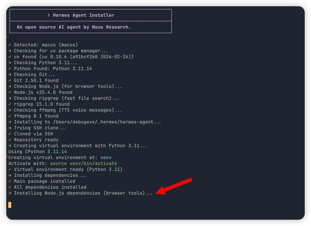 # 停止当前安装(如果在跑)pkill -f "npm install" || truepkill -f playwright || true# 进入 Hermes 目录(通常是 ~/.hermes 或你 clone 的目录)cd ~/hermes-agent # 或你安装的位置# 清理 npmrm -rf node_modules package-lock.jsonnpm cache clean --force# 重新跑一遍安装脚本curl -fsSL https://raw.githubusercontent.com/NousResearch/hermes-agent/main/scripts/install.sh | bash2、手动建立软链