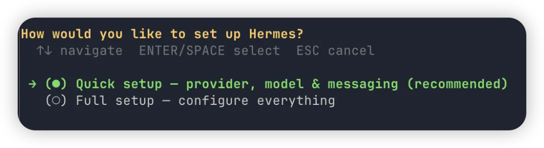 如果你经历了1.1的坑,那么这里需要敲一下命令 hermes setup。