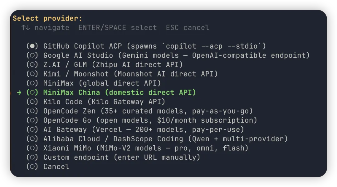Minimax 这些内置的 provider,URL 保持默认的就好,直接回车。