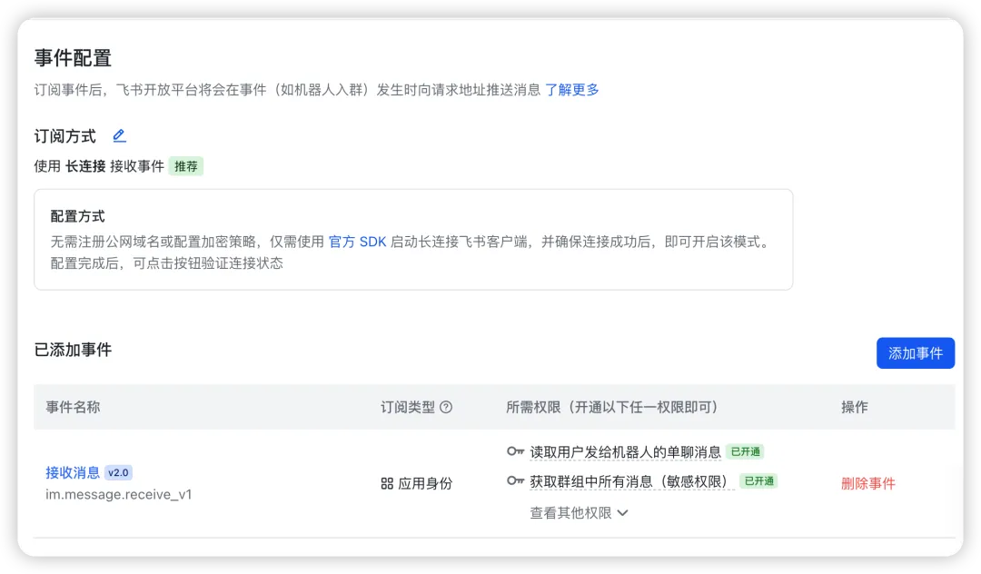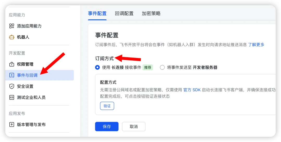 事件与回调 → 订阅方式 → 长连接 → 保存PS:这里暂时不需要点验证,等我们配置完后,把 AppID 和 AppSecret 配给 Hermes 即可。