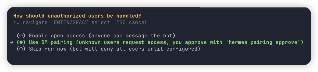 为了走完整流程,我这里使用 Use DM pairing 好了。