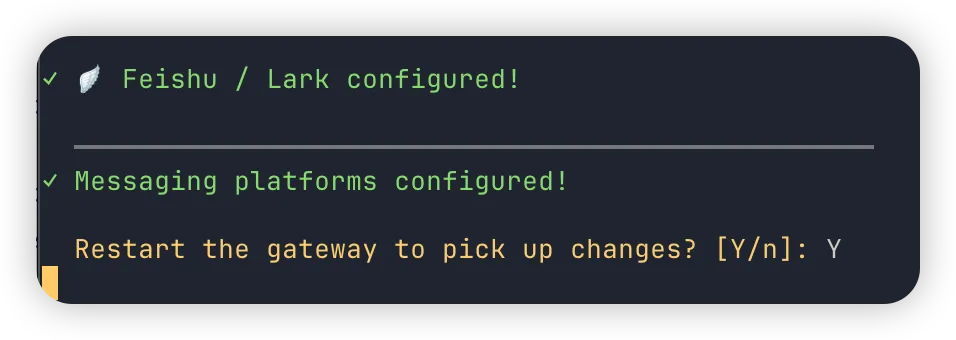 后面继续是默认回车,然后 Y 重启 gateway 来重刷配置。
