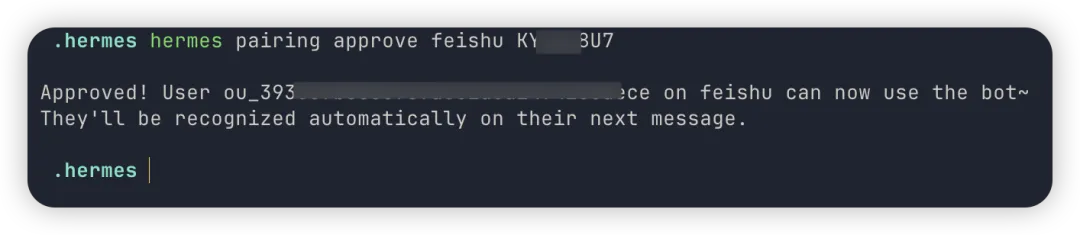拷贝这个配对码,在部署 hermes 的机器发送这行命令