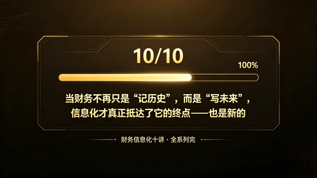 写最后一集了。前面九集聊了ERP、业财融合、管理会计,从痛点分析到三维转变,从L2C/P2P到全面预算,从合并报表到多维管报。如果你一路看下来,应该能感受到一条主线:财务信息化不是让财务更轻松,而是让财务更有用。