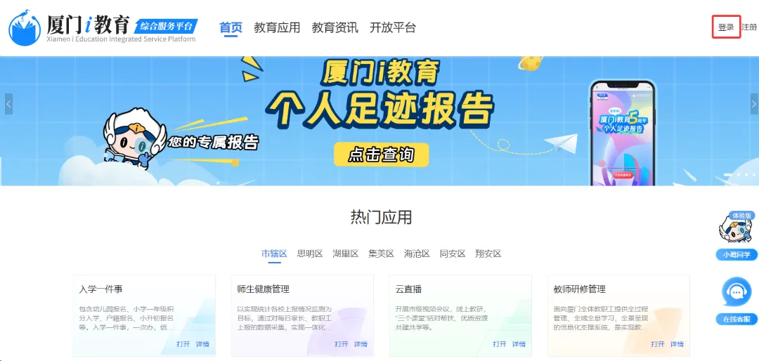 通过浏览器输入https://www.xmedu.cn,或通过浏览器搜索“i教育”,进入厦门i教育综合服务平台。