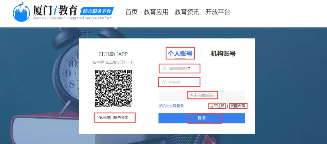点击右上角“登录”按钮进入登录界面。输入已注册的账号、密码进行登录(若有注册过i厦门账号,也可用i厦门账号登录)。