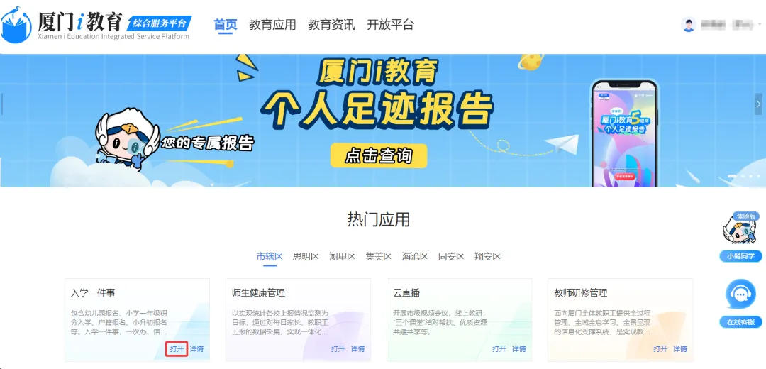 账号登录后,首页找到“入学一件事”板块,点击“打开”。登录时可直接“跳过认证”身份(家长、教职工)步骤。