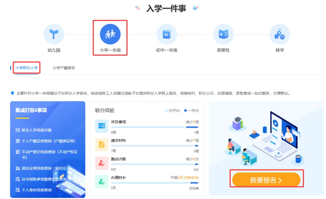 点击“小学一年级”,在“小学积分入学”板块找到“我要报名”按钮点击进入选区界面。